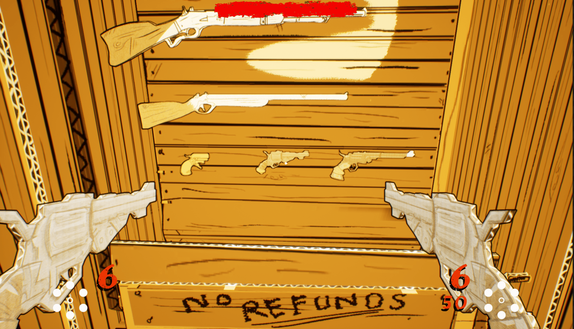 Because he couldn’t model. Not yet. “It started as an inability to create anything complex in 3D,” he says. So he cut around the wall. If everything’s a flat cut-out—a sheriff, a six-shooter, a saloon door—then he can draw a hundred of them and pour his time into the two obsessions he did have: sound and feel. Cardboard wasn’t a joke; it was permission. And Cardboard Cowboy started to sound and move like a game you can’t help but chase.